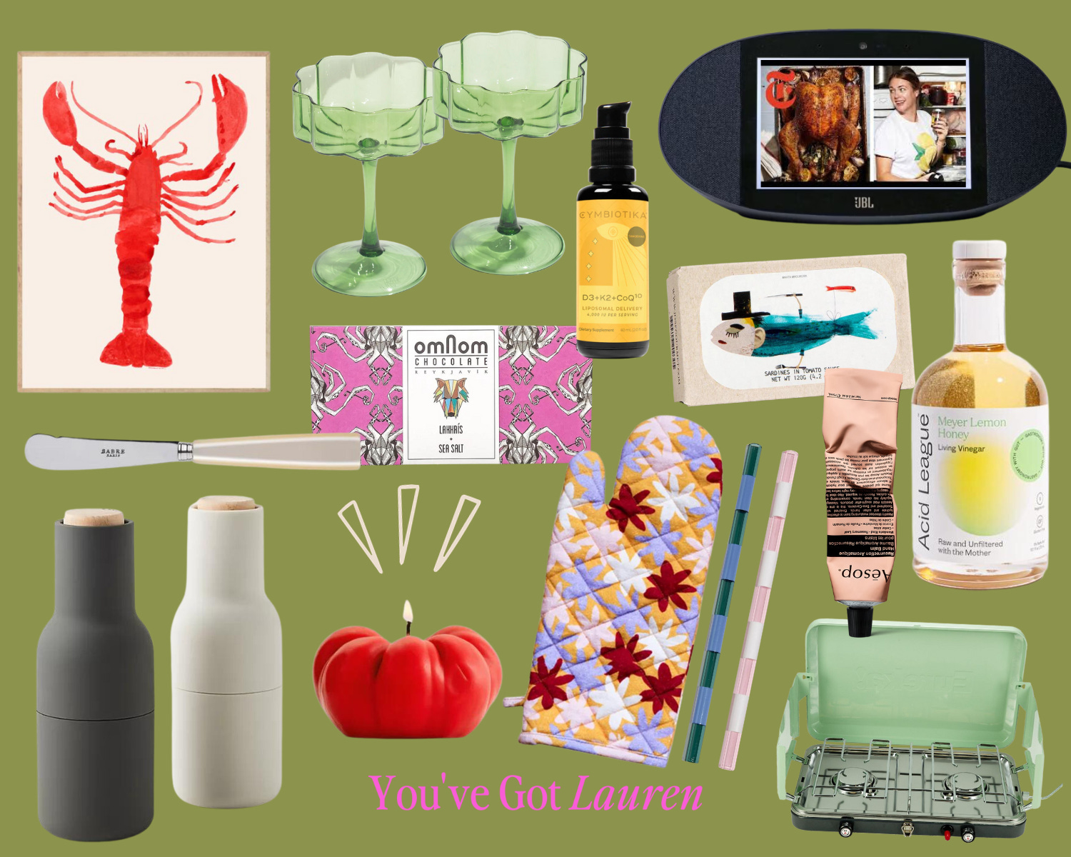 Lobster Art Print, Beautiful Salt + Pepper Grinders, Pearly Butter Knife, Artsy Glass Straws, Icelandic Chocolate Bar (Licorice + Sea Salt), Gourmet Canned Fish, Dinner Party Coupe Glasses, The Ultimate Kitchen Speakers (follow along to YouTube cooking shows), Acid League Vinegars, Classic Camping Stove, The D3-K2-CoQ10 Supplement, Botanical Hand Balm, Fancy Oven Mitts, & Heirloom Tomato Candles.