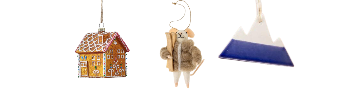 Ornaments: A traditional gingerbread house, a skiing mouse, & a ceramic mountain.