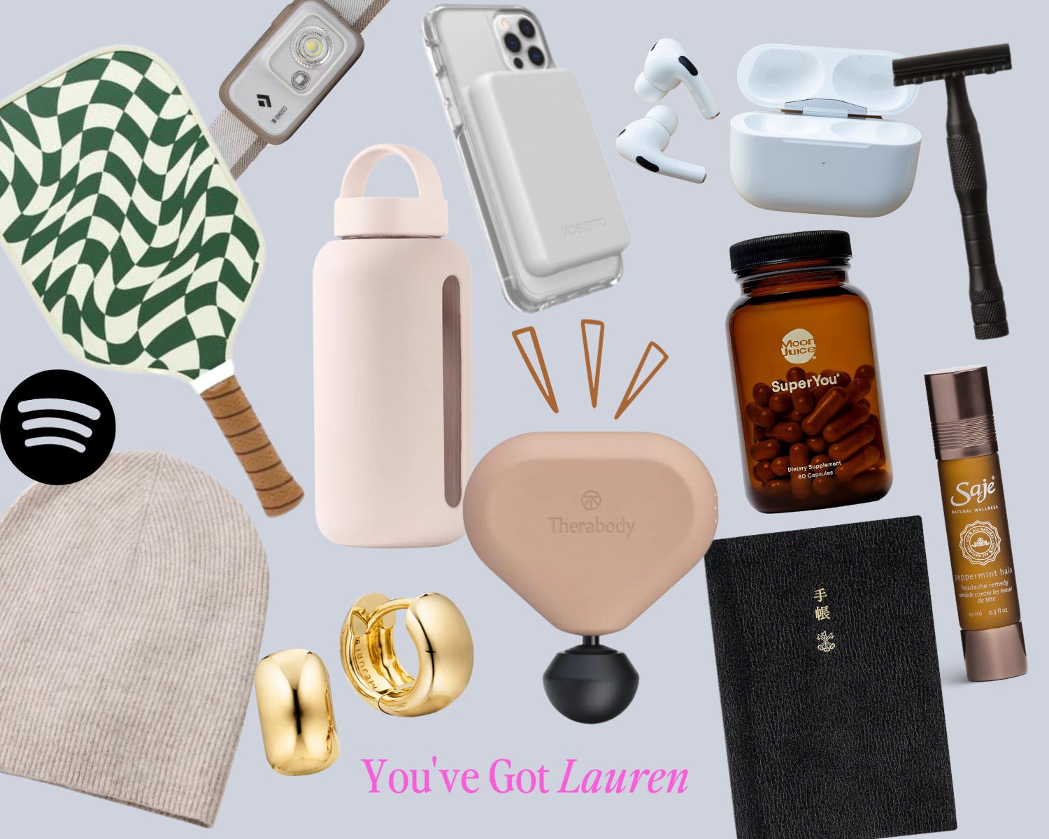 Cashmere Toque, The Best Daily Planner, Glass Water Bottle, Apple Airpods Pro, Portable Charger for iPhones, Cute Pickleball Paddles, Chunky Gold Hoop Earrings, Peppermint Halo Headache Remedy, Theragun Mini Muscle Relaxer, Black Diamond Headlamp, SuperYou Daily Vitamins, & Well Kept Safety Razor.