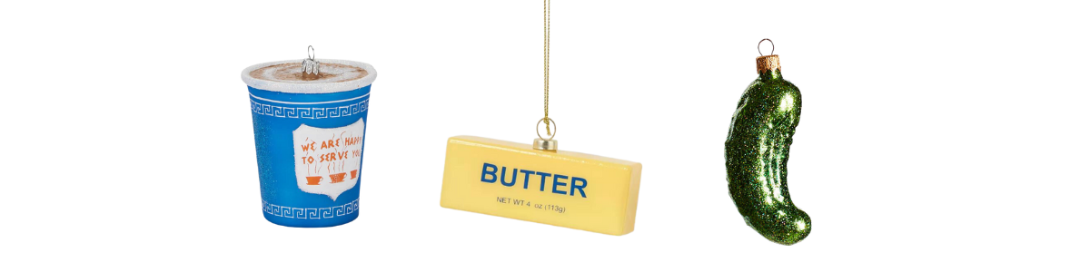 Ornaments: The NYC paper coffee cup, a stick of butter, & a Christmas pickle.