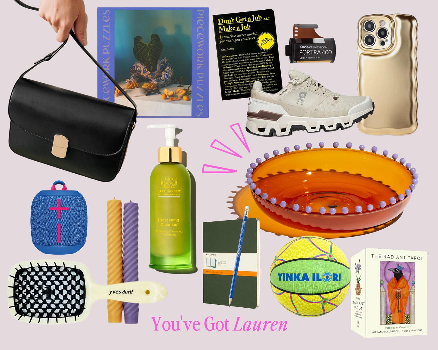 Classic Leather Purse, Glass Serving Platter, Gold iPhone Case, Moleskin 3-Pack Journals + Staedtler Pencils, Ojukokoro Edition Basketball, Vented Hair Brush, Banana Hands Puzzle, The Best Waterproof Hiking Shoes, Sculptured Candles, The Radiant Tarot Deck, Kodak Portra 400 Film, Don’t Get A Job, Make A Job Book, Waterproof Shower/Camping Speaker, & Refreshing Facial Cleanser.