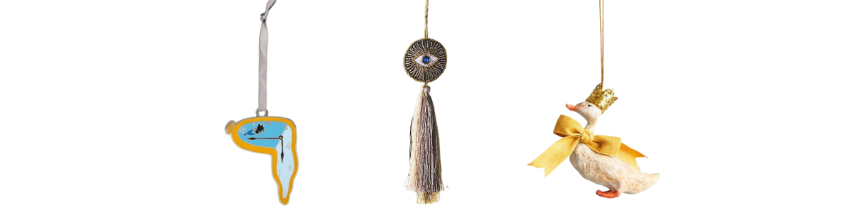 Ornaments: A Salvador Dalí clock, a third eye tassel, & a vintage duck wearing a crown.