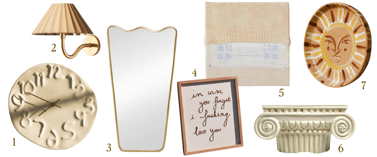 Ceramics—hand painted plates, greek columns, clocks, and vintage tiles all add great texture and style.