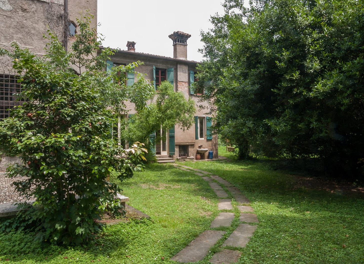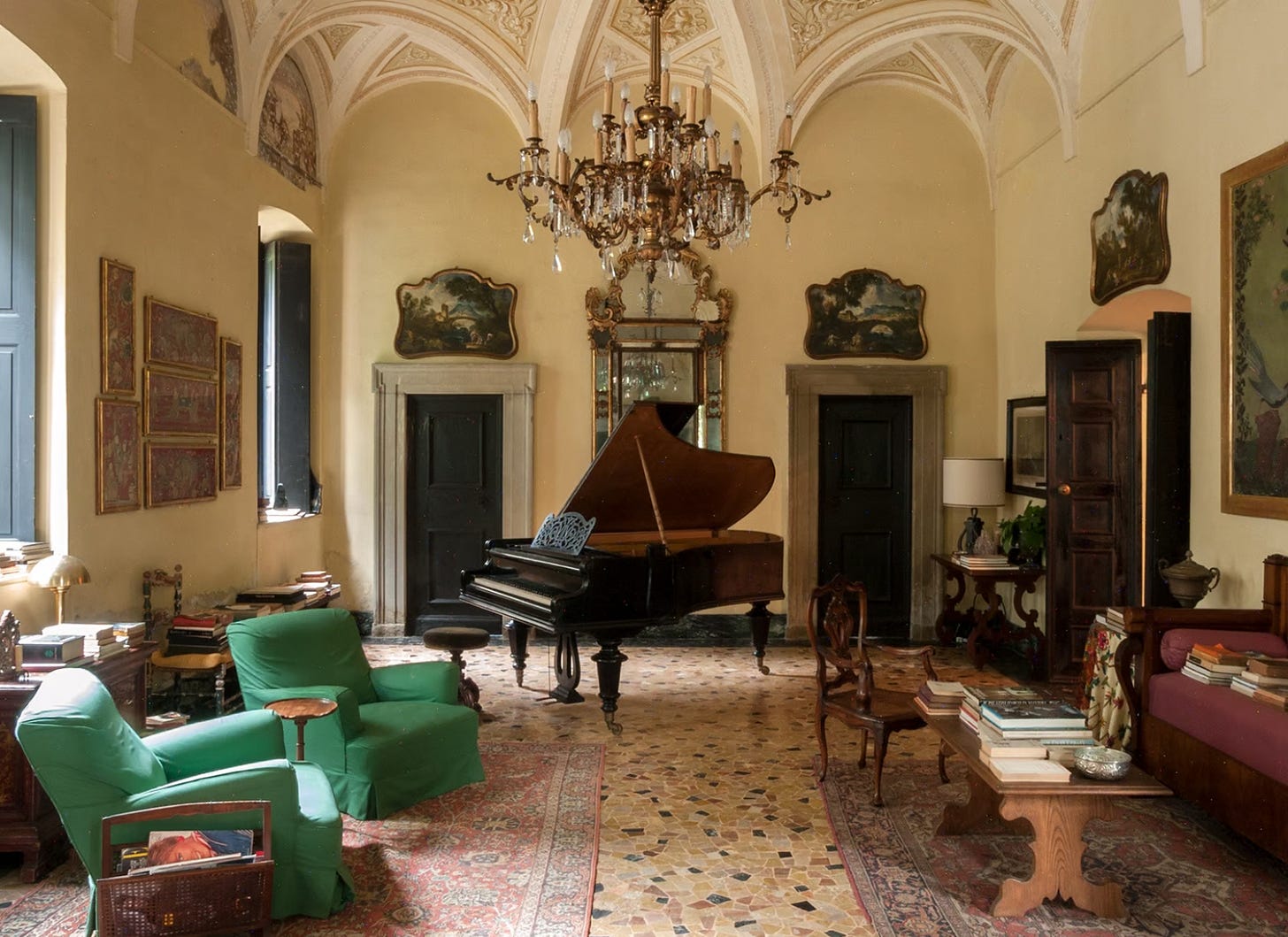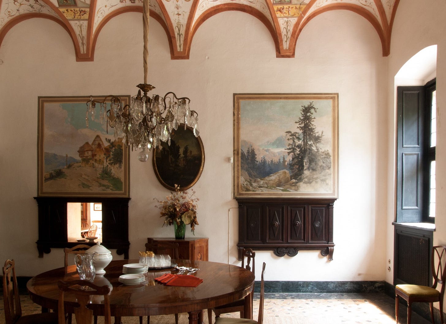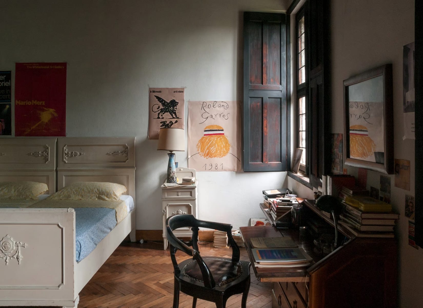 I would also like to point out the shutters on the windows. Big, heavy, and wooden—both inside and out of the villa. So clunky and sure of themselves. Just like the doors to each room—solid and loud. Everything about these older villas is a statement. From the arched ceilings with original frescoes, to the parquet flooring and fireplaces big enough to charge rent in.