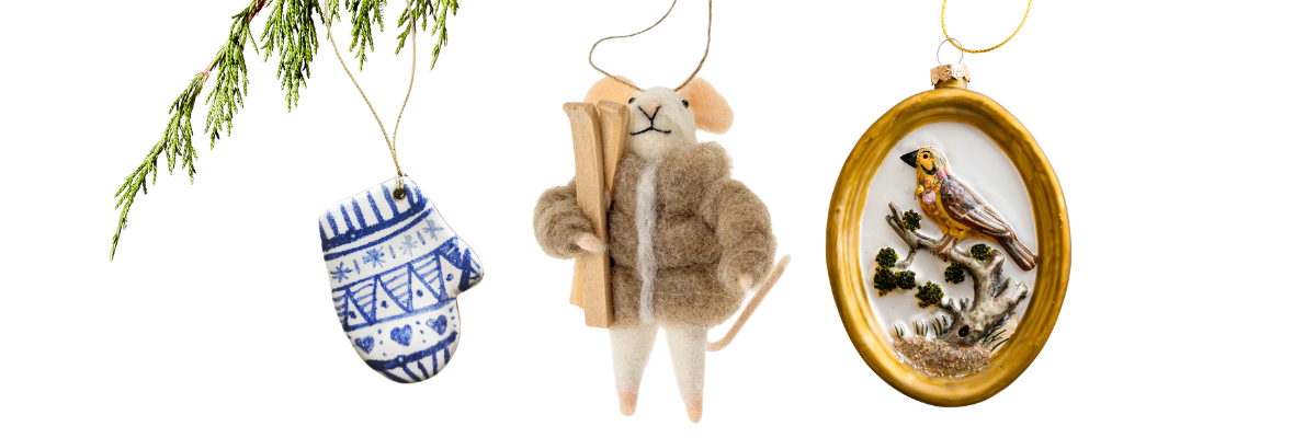Ornaments: Ceramic mitten, a skiing mouse, and a framed bird.