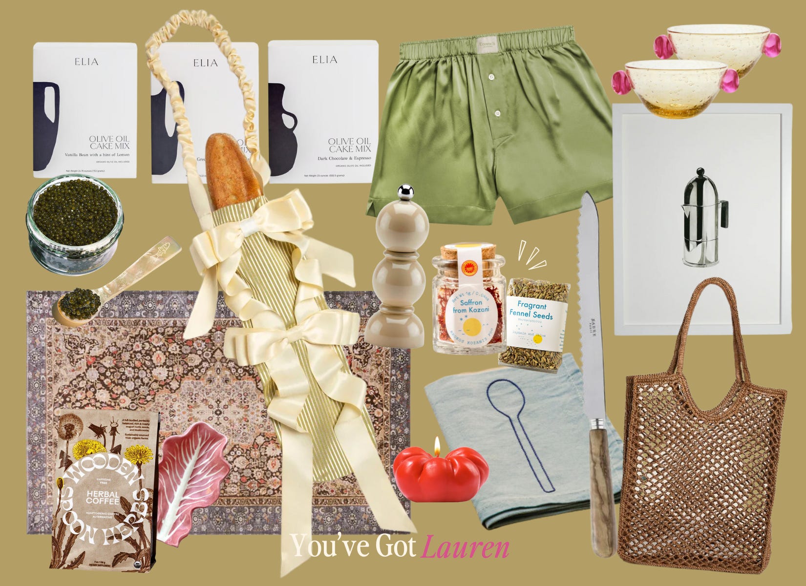 Fancy olive oil cake mixes, silk boxers for brunch, hand blown glass snack bowls, fishwife caviar for a fancy affair, ceramic radicchio dish, a popular coffee substitute, the ultimate baguette bag, the best vinyl “Persian” kitchen rugs, cappuccino salt and pepper mill, gorgeous spices from Greece, Nonna’s heirloom tomato candles, spoon embroidered cotton napkins, an olive tree wood bread knife, La Cupola watercolour painting, and this cute paper market bag.