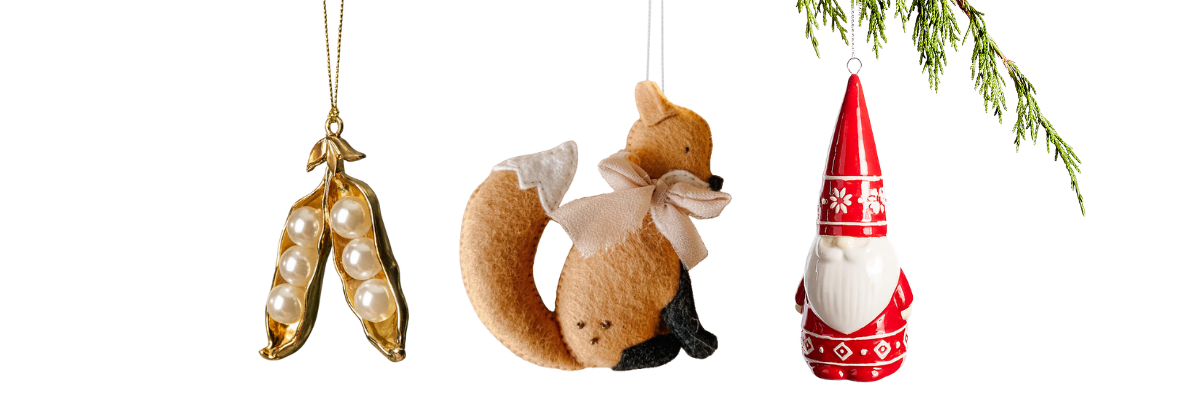 Ornaments: Pearly pea pod, enchanting felted fox, and a Nordic gnome.