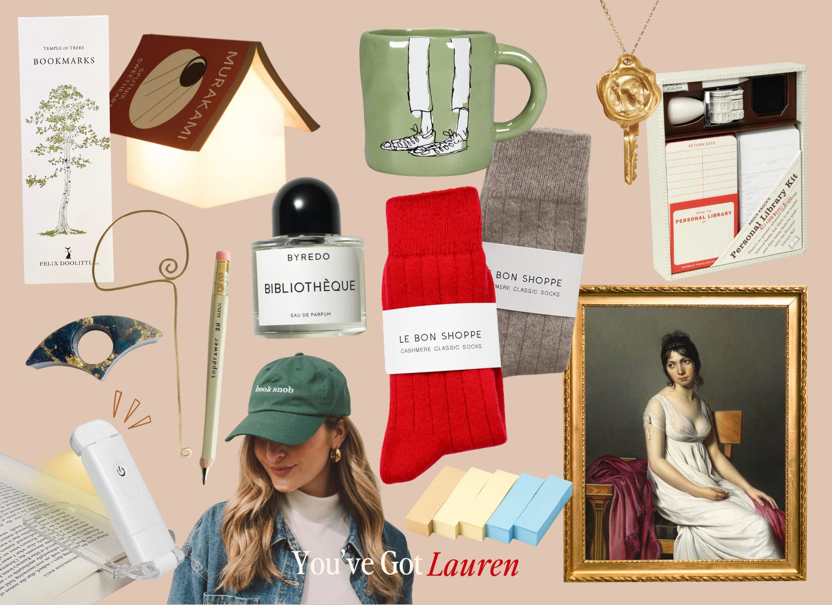 Beautiful bookmarks, a book rest lamp, bibliothèque perfume, Roald Dahl coffee mug, the best cashmere reading socks, this ‘key to the library’ necklace, a personal library kit for those who lend out their books, Ottessa Moshfegh framed cover art, sticky note page markers, embroidered book snob hat, wooden mechanical pencils, brass shell book jewelry, my favourite rechargeable book light, and a cute page holder.