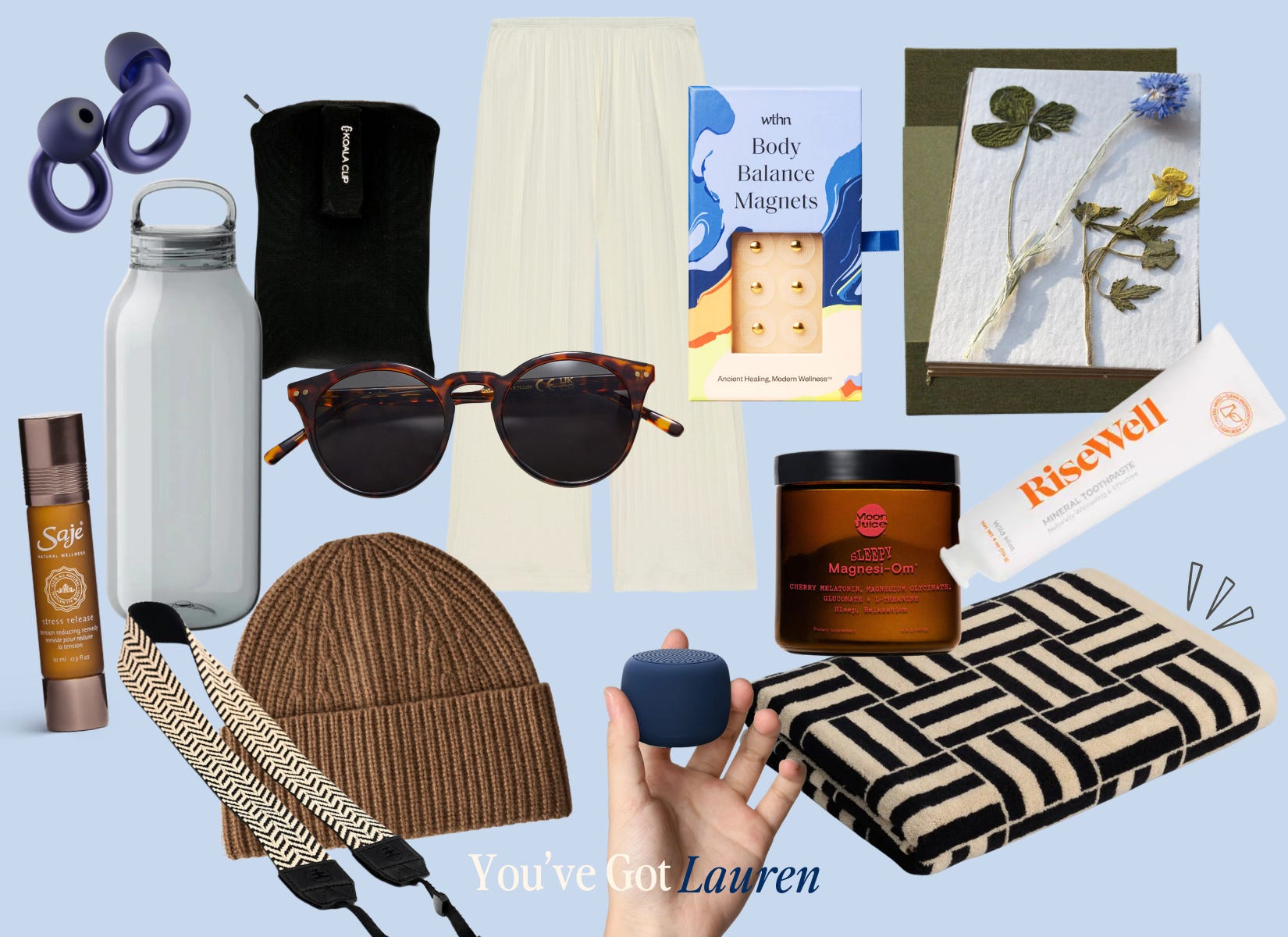 Loop earplugs for maximum focus, the Koala phone clip (best option for running), the Kinto water bottle, an extra pair of sunglasses, the Pointelle organic cotton crop pant, body balance acupressure magnets, this flower press kit, my fave hydroxyapatite toothpaste, sleepy time magnesi-om powder, organic cotton beach towel (I would like my husband to use), portable white noise machine, ribbed cashmere beanie, a woven tapestry camera strap, and the best stress release blend.